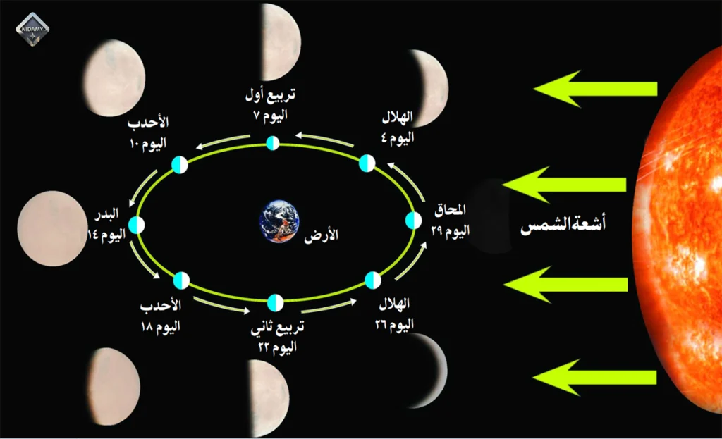 1. الهلال: يظهر خلال الأسبوع الأول من الشهر القمري، حيث يكون الجزء المضيء أتعلم