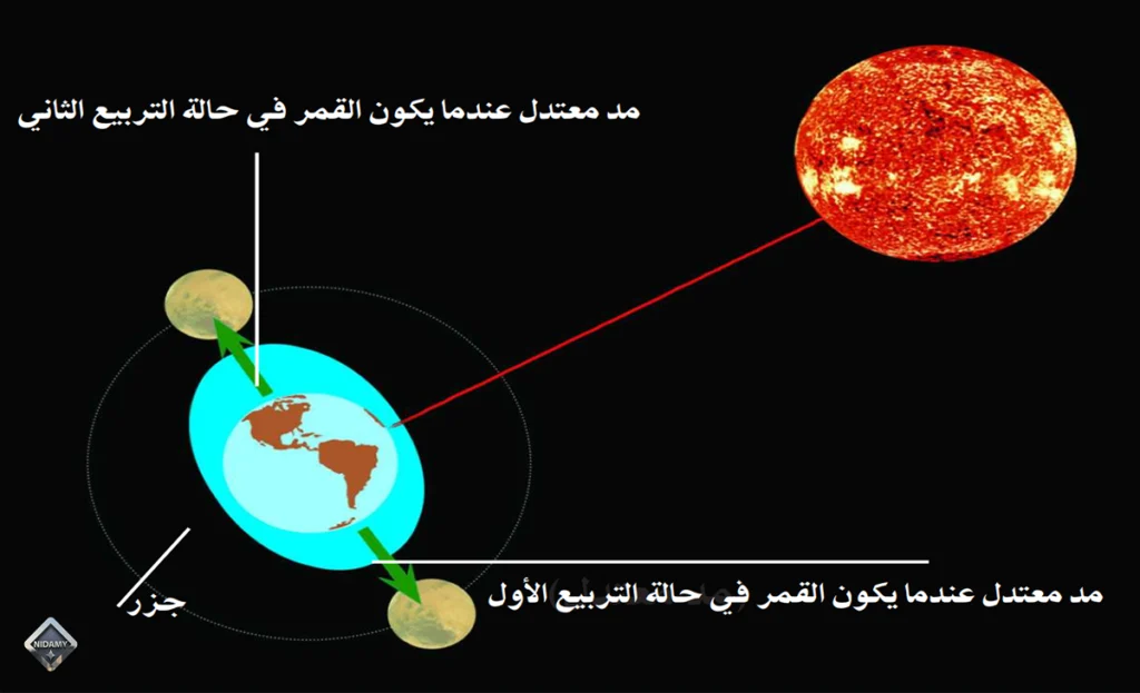 •  المد المعتدل: هو ارتفاع معتدل في مستوى الماء، لا يصل إلى مستوى المد العالي، ويحدث عندما يقع القمر في حالة التربيع الأول أو الثاني مع الشمس على طول ضلع زاوية قائمة مركزها الأرض، حيث تقلل قوة جذب الشمس للأرض من قوة جذب القمر للمسطحات المائية.
